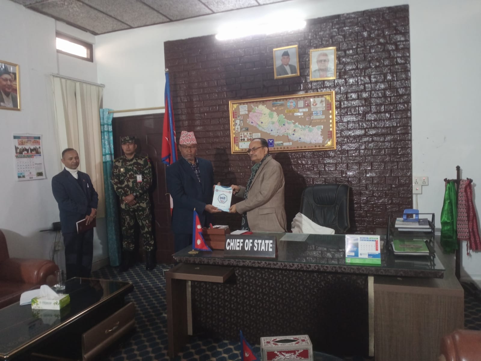 मधेश प्रदेशका प्रदेश प्रमुख सुरेन्द्र लाभ कर्णज्यूले प्रदेश प्रमुख कार्यालय जनकपुरधाममा गृहमन्त्री ओमप्रकाश अर्याललाई मायाको चिनो प्रदान गर्नुहुँदै (२०८२/०९/३०)